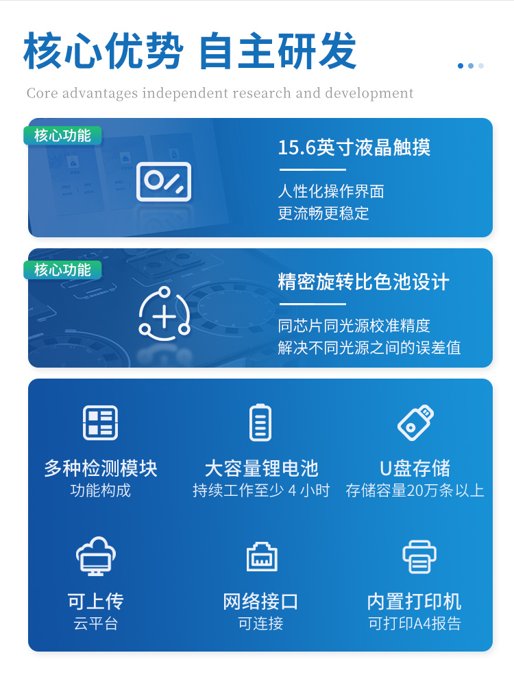 | 儀器采用臺式一體化系統(tǒng)檢測技術(shù),將分光光度模塊、膠體金檢測模塊、新型農(nóng)殘檢測模塊、數(shù)字化管理模塊、無線通訊模塊高度集成于一體,支持檢測200種食品安全檢測項(xiàng)目,同時(shí)預(yù)留升級檢測方法。 | 儀器檢測模塊標(biāo)準(zhǔn)化、智能化,可隨意自由組合。檢測箱體內(nèi)置多個標(biāo)準(zhǔn)檢測單元,檢測模塊可以調(diào)整配置。 | 顯示屏幕:儀器采用10.1英寸豎向液晶觸摸屏顯,搭配運(yùn)行安卓智能操作系統(tǒng),主控芯片采用ARM Cortex-A7,RK3288/4核處理器,主頻1.88Ghz,操作方便,性能更強(qiáng)。 | 檢測通道:≥24通道;采用精密旋轉(zhuǎn)比色池設(shè)計(jì),使用同芯片同光源校準(zhǔn)精度,解決不同光源之間的誤差值,更加準(zhǔn)確**。(1-12通道間誤差0.1%,**號:ZL202022821055.2) | 儀器光源:高精度進(jìn)口四波長冷光源,每個通道均配置 410、520、590、630nm 波長光源,標(biāo)配**的光路切換裝置,**光路切換功能可實(shí)現(xiàn)64波長,并且所有檢測項(xiàng)目可實(shí)現(xiàn)所有通道同時(shí)檢測。 | 設(shè)備可一鍵校準(zhǔn),自動保存校準(zhǔn)數(shù)據(jù),自動對比校驗(yàn),得到精準(zhǔn)光源,采用Android SP存儲數(shù)據(jù),光源數(shù)據(jù)永不丟失,方便每一次使用。 | 通訊接口:配備無線通信模塊、可選配4G(APN)通訊模塊和藍(lán)牙傳輸,同時(shí)具有雙USB接口以及RJ45網(wǎng)線接口,可以多方式實(shí)現(xiàn)數(shù)據(jù)保存及數(shù)據(jù)傳輸。 | 存儲方式:支持U盤存儲,標(biāo)準(zhǔn)USB接口,免驅(qū)動安裝。檢測結(jié)果存儲容量20萬條以上,可生成Excel表格進(jìn)行拷貝,并具有登錄保護(hù)功能。 | 智能化操作系統(tǒng): | 1、操作系統(tǒng):儀器可在同一檢測界面自動對應(yīng)相關(guān)檢測通道,一次性選擇1-12個樣品名稱,無需退出界面,節(jié)省操作時(shí)間。并可以對每個通道屬性和樣品信息單獨(dú)進(jìn)行編輯,例如送檢單位、人員,檢測人員等,打印時(shí)勾選打印顯示。 | 2、數(shù)據(jù)集成系統(tǒng):設(shè)備首頁自動匯總分析檢測數(shù)據(jù),包含:周檢測數(shù)據(jù)、月檢測數(shù)據(jù),總檢測數(shù)量,均包含檢測總數(shù),合格數(shù),不合格數(shù),以及相關(guān)柱形分析圖,各項(xiàng)檢測數(shù)據(jù)一目了然,無需電腦查詢,更加快捷直觀。 | 3、數(shù)據(jù)庫系統(tǒng):十幾項(xiàng)數(shù)據(jù)庫分類管理儀器:包含項(xiàng)目類型、項(xiàng)目數(shù)據(jù)、檢測數(shù)據(jù)、歷史記錄、國標(biāo)信息、曲線信息、采樣信息、檢測信息、受檢信息、復(fù)核信息、圖表信息、光源校準(zhǔn)信息、打印樣式信息、樣品庫信息等等,數(shù)據(jù)庫之間互相協(xié)調(diào)聯(lián)動保證數(shù)據(jù)的真實(shí)完整性。同時(shí)產(chǎn)品數(shù)據(jù)庫以及歷史檢測記錄支持一鍵檢索功能。 | 4、限量規(guī)判系統(tǒng):具有限量查詢、添加物質(zhì)合規(guī)判定系統(tǒng)。檢測出結(jié)果后,系統(tǒng)自動調(diào)用系統(tǒng)數(shù)據(jù)庫中相關(guān)國標(biāo)進(jìn)行比對判定,客觀顯示判定結(jié)果是否合格。 | 5、項(xiàng)目預(yù)設(shè)系統(tǒng):儀器具有任務(wù)預(yù)設(shè)模塊,一鍵提前預(yù)設(shè),給出方便快捷的新檢測方案,每一個任務(wù)分別可以設(shè)置不同的樣品、批次、編號、來源、備注、抽樣信息、檢測信息、受檢信息、復(fù)核信息等更多信息。樣品送檢時(shí)一鍵調(diào)取保存信息,并可多次調(diào)取,大大提高檢測效率。 | 6、數(shù)據(jù)監(jiān)管系統(tǒng):同步對接監(jiān)管平臺,數(shù)據(jù)可局域網(wǎng)和互聯(lián)網(wǎng)數(shù)據(jù)上傳,檢測結(jié)果可直接傳至食品安全監(jiān)管平臺。進(jìn)行區(qū)域食品安全監(jiān)管及大數(shù)據(jù)分析處理與數(shù)據(jù)統(tǒng)計(jì),監(jiān)測區(qū)域食品安全長短期動態(tài)及問題預(yù)估、預(yù)警。 | 7、全新打印系統(tǒng):內(nèi)置全新打印機(jī),新創(chuàng)自定義打印方式,可按需靈活勾選控制:產(chǎn)品合格證(國家農(nóng)業(yè)部標(biāo)準(zhǔn)要求),二維碼,抽樣信息、檢測信息,受檢信息、復(fù)核信息、抽樣日期、檢測日期等信息的打印。 | 8、A4紙版本報(bào)告打印功能(可選配):設(shè)備擁有兩種結(jié)果展示方式,可以自動生成A4打印模板和小票打印模板兩種樣式,可通過WiFi及網(wǎng)線等方式鏈接外置打印機(jī)可進(jìn)行打印。 | 供電模式:儀器交直流兩用,直流12V供電,可連接車載電源,可配6ah大容量充電鋰電池,電量可實(shí)時(shí)顯示,方便戶外流動測試。 | 膠體金檢測模塊:采用雙通道CMOS成像處理技術(shù)及膠體金免疫層析技術(shù),可同時(shí)讀取雙膠體金卡數(shù)據(jù),自動采集、處理分析,將檢測結(jié)果顯示,并可根據(jù)參考限值自動判斷檢測結(jié)果,可檢測常見的獸藥殘留、生物毒素、抗生素、違禁添加物等。 | 1、探測技術(shù):CMOS成像探測; | 2、檢測通道:2通道,可同時(shí)讀取2個膠體金卡數(shù)據(jù); | 3、檢測方式:消線法和比色法; | 4、顯示模式:陰性或陽性; | 5、曲線形式:直插式掃描方式,顯示金標(biāo)卡圖像,實(shí)時(shí)生成、識別CT曲線圖,無需手動調(diào)整,完成檢測后自動退出檢測卡。兼容市場上其他金標(biāo)卡,
