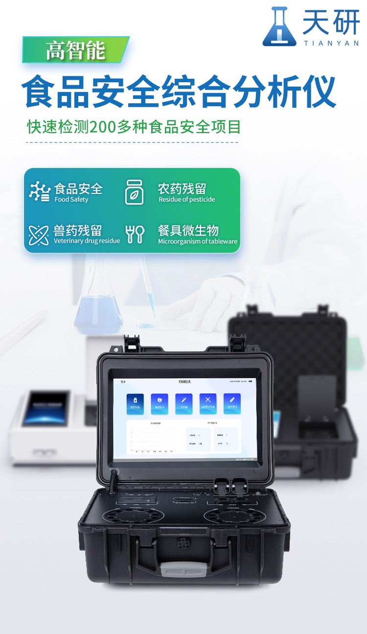 山東天研儀器有限公司生產(chǎn)的高智能食品安全檢測(cè)儀為集成化食品安全快速檢測(cè)分析設(shè)備,采用臺(tái)式一體化設(shè)計(jì),可快速檢測(cè)200多種食品安全項(xiàng)目,包含非食用化學(xué)物質(zhì)、濫用食品添加劑、農(nóng)藥殘留、獸藥殘留、重金屬、病害肉、營(yíng)養(yǎng)強(qiáng)化劑、抗生素類(lèi)殘留、激素類(lèi)殘留、真菌毒素類(lèi)殘留、化學(xué)類(lèi)殘留等項(xiàng)目的定性定量檢測(cè)。目前廣泛應(yīng)用于市場(chǎng)監(jiān)管局、檢測(cè)中心、衛(wèi)生監(jiān)督部門(mén)、農(nóng)業(yè)部門(mén)、院校及各單位食堂、食品肉產(chǎn)品深加工企業(yè)、商超市場(chǎng)、司法部門(mén)、餐飲機(jī)構(gòu)、養(yǎng)殖場(chǎng)、屠宰場(chǎng)、檢驗(yàn)檢疫部門(mén)等單位。