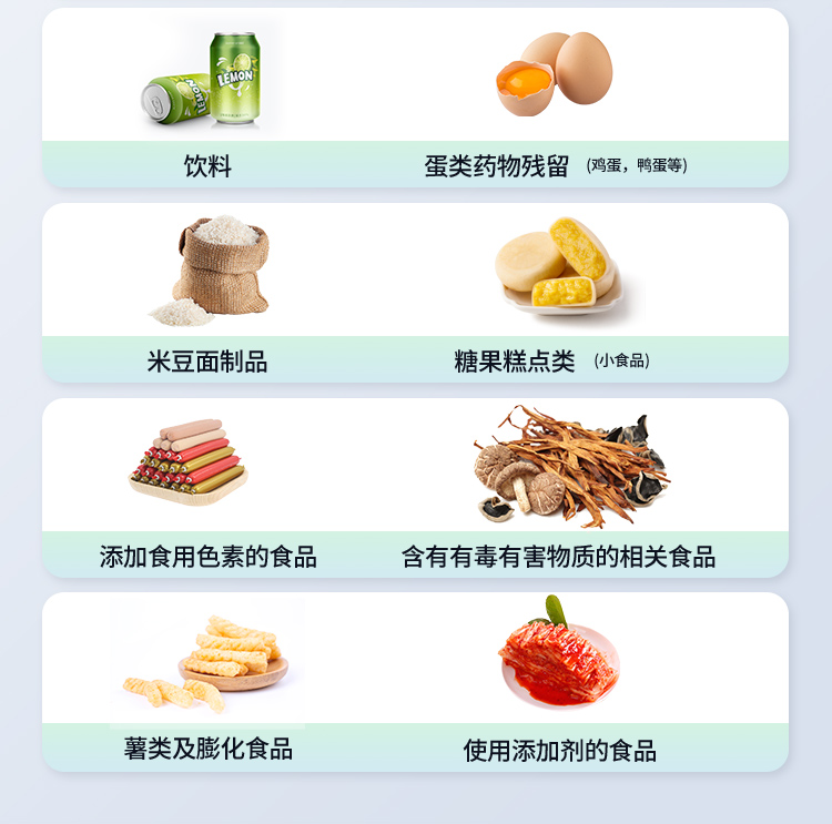 | 食品添加劑:二氧化硫、雙氧水、亞硝酸鹽、硝酸鹽、苯甲酸鈉、山梨酸鉀、糖精鈉、甜蜜素、木耳硫酸鎂等 | 有毒有害物質(zhì):甲醛、吊白塊、硼砂、過(guò)氧化苯甲酰、溴酸鉀、羅丹明B、三聚氰胺、蘇丹紅、工業(yè)堿、尿素、明礬等 | 果蔬:農(nóng)藥殘留(酶抑制率法) | 病害肉:組胺、揮發(fā)性鹽基氮 | 重金屬含量:鉛、鎘、鉻、汞、砷、錫、鎳、鋁等 | 水酒飲品分析:酒中甲醇、乙醇、乳品及牛奶中蛋白質(zhì) | 調(diào)味品成分: 食醋的總酸、醬油的總酸、芝麻油純度、谷氨酸鈉、醬油氨基酸態(tài)氮、食鹽中亞鐵氰化鉀、食鹽中碘等 | 食用色素類(lèi):紅色色素(胭脂紅、莧菜紅、莧菜紅)、黃色色素(檸檬黃、日落黃)、藍(lán)色色素(亮藍(lán))等 | 蜂蜜成分:果糖和葡萄糖、蔗糖、淀粉酶、酸度等 | 食用油脂:過(guò)氧化值、酸價(jià)等 |