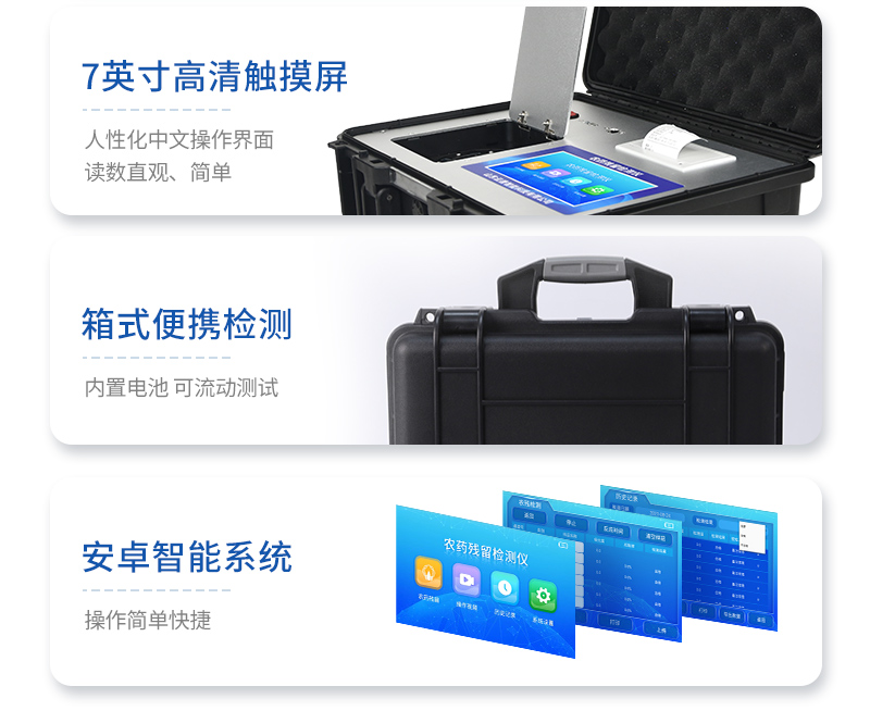 | 機(jī)器采用全新安卓智能系統(tǒng),主控芯片采用 ARM Cortex-A7,RK3288/4核處理器,主頻1.88Ghz,運(yùn)轉(zhuǎn)速度更快速,穩(wěn)定性更強(qiáng)。 | 創(chuàng)新檢測(cè)模式: *儀器采用精密旋轉(zhuǎn)比色池設(shè)計(jì),使用光源一致,可以解決各通道間由于光源誤差帶來的檢測(cè)結(jié)果誤差問題,檢測(cè)結(jié)果更加精準(zhǔn)。 *儀器具有自動(dòng)識(shí)別比色皿檢測(cè)功能,即:將樣品比色皿放入儀器后,點(diǎn)擊樣品檢測(cè),儀器自動(dòng)識(shí)別比色皿進(jìn)行通道檢測(cè)。 | 供電方式:交直流兩用,直流 12V 供電,可連接車載電源,可配 6ah 大容量充電鋰電池,方便戶外流動(dòng)測(cè)試。 | 顯示方式:7英寸液晶觸摸屏顯示,人性化中文操作界面,讀數(shù)直觀、簡(jiǎn)單。 | 檢測(cè)通道:8個(gè)檢測(cè)通道,可以同時(shí)測(cè)試多個(gè)樣品,循環(huán)檢測(cè),即放即檢,每個(gè)樣品由程序控制分別獨(dú)立工作,不會(huì)互相干擾。 | 高精光源系統(tǒng): ①儀器光源采用進(jìn)口超高亮發(fā)光二極管,光源亮度可以自動(dòng)調(diào)節(jié)與校準(zhǔn) ②智能恒流穩(wěn)壓,光強(qiáng)自動(dòng)校準(zhǔn),長(zhǎng)時(shí)間連續(xù)工作光源無溫漂現(xiàn)象。 | 智能操作分析系統(tǒng): ①儀器具有100多種蔬菜名稱菜單庫(kù),分類管理,并可按需添加或刪除、編輯蔬菜名稱;可在同一檢測(cè)界面自動(dòng)對(duì)應(yīng)相關(guān)檢測(cè)通道一次性選擇1-24個(gè)樣品名稱,無需退出界面,節(jié)省操作時(shí)間。 ②內(nèi)置新國(guó)家限量標(biāo)準(zhǔn),與所測(cè)結(jié)果進(jìn)行現(xiàn)場(chǎng)比對(duì),并持續(xù)更新標(biāo)準(zhǔn)。 | 完善的配套硬件: ①采用串口5v打印機(jī),可選擇手動(dòng)打印或者自動(dòng)打印,三分鐘出打印結(jié)果,打印格式為檢測(cè)人姓名、吸光度差值、檢測(cè)時(shí)間、檢測(cè)機(jī)構(gòu)、樣品名稱及結(jié)果判定。 ②儀器具有無線上傳模塊,檢測(cè)結(jié)果可批量打印,批量上傳。 | 數(shù)據(jù)調(diào)用: ①儀器可存儲(chǔ)20萬條檢測(cè)結(jié)果, ②檢測(cè)結(jié)果為Excel表格,方便后期進(jìn)行數(shù)據(jù)分析與匯總報(bào)告 ③儀器采用USB2.0接口設(shè)計(jì),支持 U 盤存儲(chǔ),方便數(shù)據(jù)的存貯和移動(dòng),并可隨時(shí)與計(jì)算機(jī)直接相連,實(shí)現(xiàn)數(shù)據(jù)查詢、瀏覽、分析、統(tǒng)計(jì)、打印等。 | 后期產(chǎn)品固件可升級(jí)。 | 安全證書,放心保障:儀器具有中國(guó)計(jì)量科學(xué)研究院校準(zhǔn)證書,**認(rèn)證,使用放心。 | 機(jī)箱采用工業(yè)級(jí)ABS工程塑料箱,方便攜帶,穩(wěn)固耐用,便于流動(dòng)測(cè)試。 |