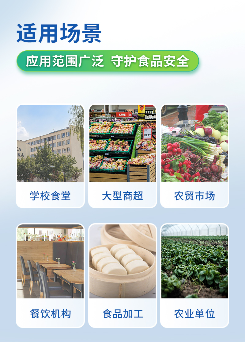 目前廣泛應(yīng)用于市場監(jiān)管局、檢測中心、衛(wèi)生監(jiān)督部門、農(nóng)業(yè)部門、院校及各單位食堂、、商超市場、司法部門、餐飲機(jī)構(gòu)、檢驗(yàn)檢疫部門等單位使用。