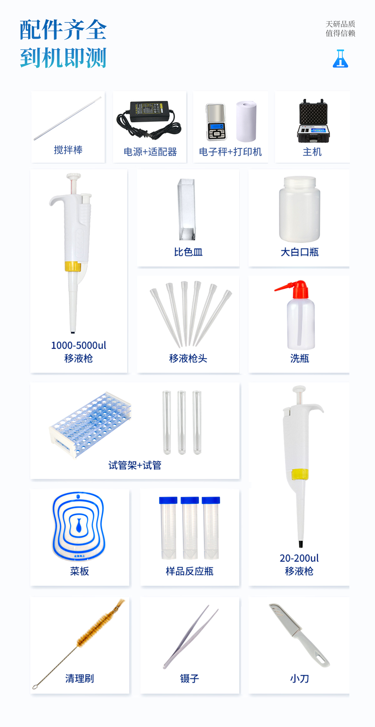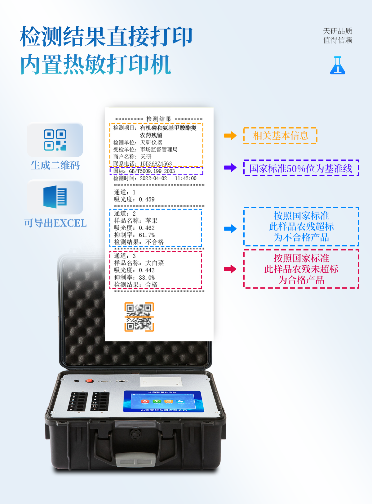 | 機箱采用工業(yè)級ABS工程塑料箱,方便攜帶,穩(wěn)固耐用,便于流動測試。 | 智能操作系統(tǒng),采用更加人性化操作,主控采用多核處理器,主頻1.88Ghz,運轉(zhuǎn)速度更快速,穩(wěn)定性更強。 | 自動判斷樣品是否合格,檢測結(jié)果更加直觀。 | 儀器具有100多種蔬菜名稱菜單庫,分類管理,并可按需添加或刪除蔬菜名,編輯蔬菜名稱,可直接打印出蔬菜名稱。 | 檢測通道:6個檢測通道,可以同時測試多個樣品,循環(huán)檢測,即放即檢,每個樣品由程序控制分別獨立工作,不會互相干擾。 | 儀器具有wifi聯(lián)網(wǎng)功能,可將數(shù)據(jù)快速上傳電腦,進行數(shù)據(jù)管理與統(tǒng)計,4G信號GPRS遠傳功能,可插手機卡實現(xiàn)數(shù)據(jù)遠傳平臺,。 | 顯示方式:7英寸高靈敏真彩觸摸屏顯示,人性化中文操作界面,讀數(shù)直觀、簡單。 | 打印機采用串口5v打印,可選擇手動打印或者自動打印,三分鐘出打印結(jié)果,打印格式為檢測人姓名、吸光度差值、檢測時間、檢測機構(gòu)、樣品名稱及結(jié)果判定。 | 光源采用進口超高亮發(fā)光二極管,具有低功耗、高精度、穩(wěn)定性強、光源可控可以關掉不使用的光源,響應速度快等優(yōu)點。 | 智能恒流穩(wěn)壓,光強自動校準,長時間連續(xù)工作光源無溫漂現(xiàn)象。 | 采用USB2.0接口設計,方便數(shù)據(jù)的存貯和移動,并可隨時與計算機直接相連,并且可用計算機控制儀器。實現(xiàn)數(shù)據(jù)查詢、瀏覽、分析、統(tǒng)計、打印等。 | 智能化程度高,儀器具有自檢功能:具有開機自檢和調(diào)零功能,具有自動檢測重復性功能 | 儀器具有自身保護功能,可設置用戶名及密碼,防止非工作人員操作等。 | 采用DC12v直流供電,安全系統(tǒng)更高,并且配備6A鋰電池充電器。 | 儀器具有重新校準、鎖定、恢復出廠設置功能。 |