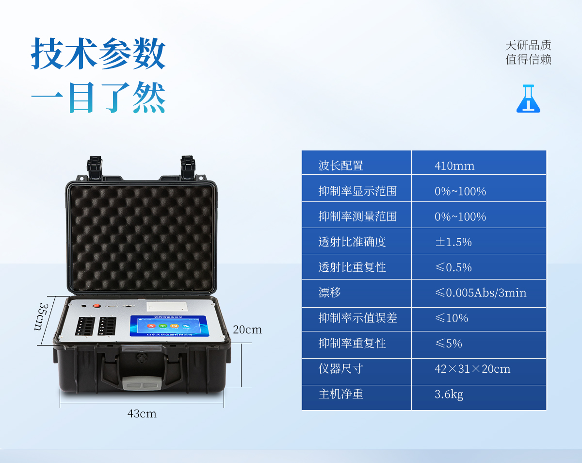 | 410nm | 0%~100% | 0%~100% | ±1.5% | ≤0.5% | ≤0.005Abs/3min | ≤10% | ≤5% | 43×35×20cm | 5.1kg |