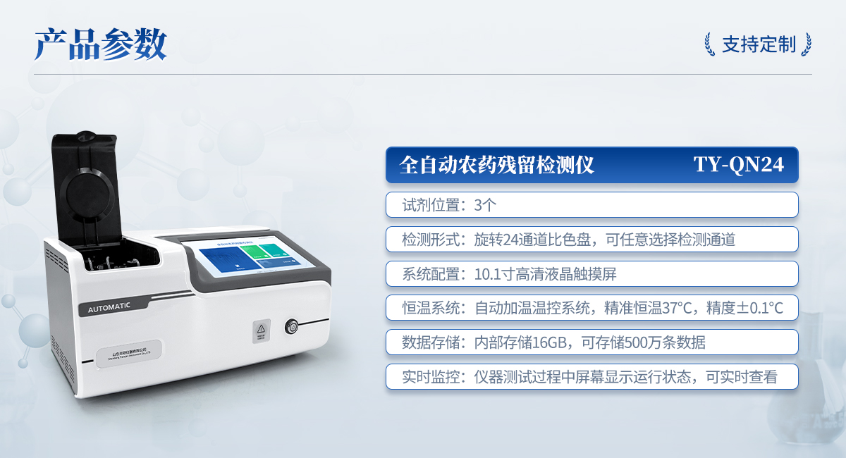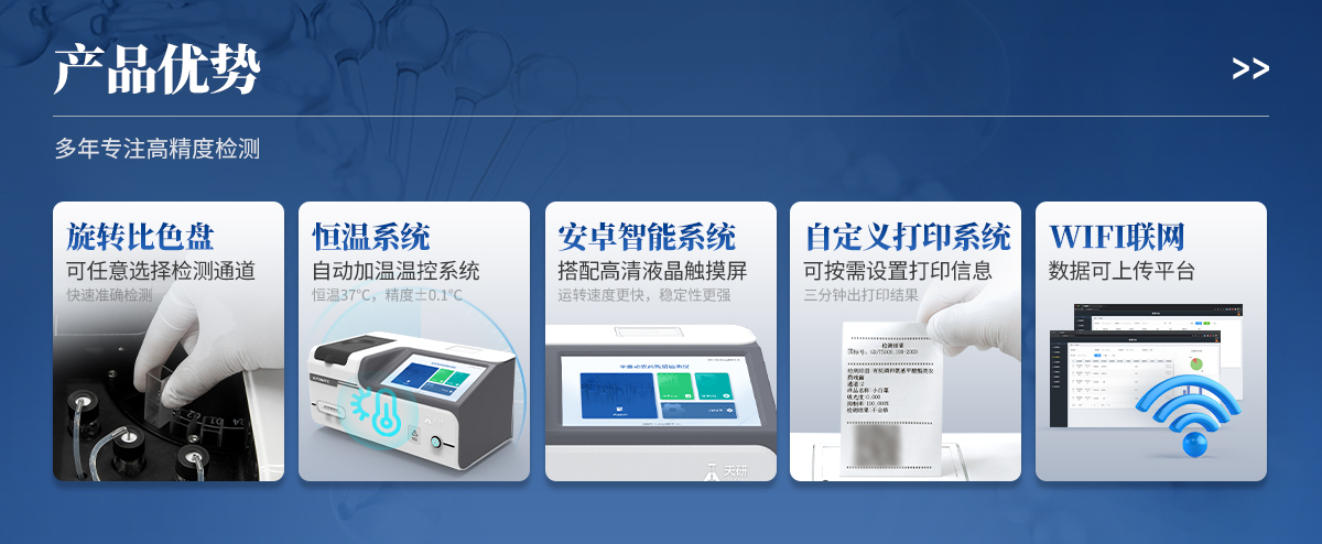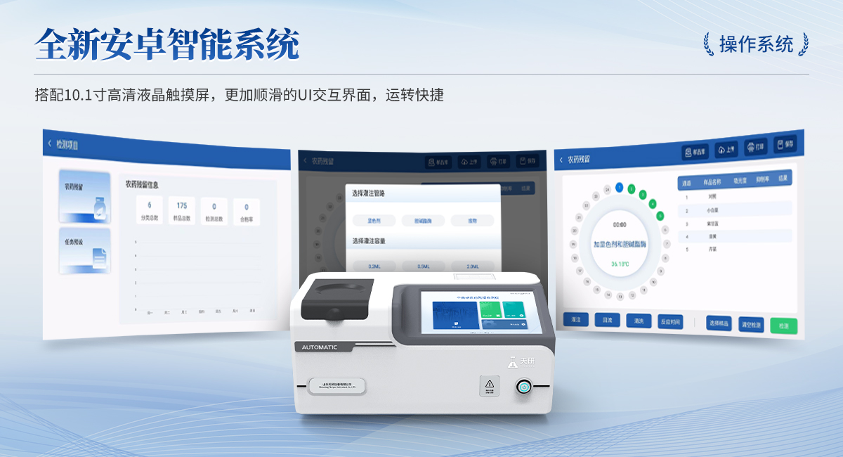 | 1. 試劑位置:3個(gè) | 2. 檢測(cè)形式:旋轉(zhuǎn)24通道比色盤,可任意選擇檢測(cè)通道,自動(dòng)對(duì)應(yīng)選擇通道。 | 3. 系統(tǒng)配置:10.1寸高清液晶觸摸屏,采用ARM Cortex?-A7,RK3288/4核處理器,運(yùn)行內(nèi)存1GB。Android7.1.1 系統(tǒng)分辨率1280×800。 | 4.恒溫系統(tǒng):具有自動(dòng)加溫溫控系統(tǒng),精準(zhǔn)恒溫37℃,精度±0.1℃。 | 5.添加系統(tǒng):儀器按照試劑要求自動(dòng)、按時(shí)、按量加入試劑,并且自動(dòng)對(duì)未正常放置的樣本或異常的樣本進(jìn)行檢查并提示。 | 6.清洗功能:儀器具備回流及自動(dòng)清洗管路功能,避免試劑污染。 | 7.混勻功能:設(shè)備具備自動(dòng)混勻功能。 | 8.光源校準(zhǔn):設(shè)備可自動(dòng)校準(zhǔn),確保檢測(cè)準(zhǔn)確度。 | 9.實(shí)時(shí)監(jiān)控:儀器測(cè)試過程中屏幕顯示運(yùn)行狀態(tài),可實(shí)時(shí)查看。 | 10.數(shù)據(jù)存儲(chǔ):內(nèi)部存儲(chǔ)16GB,可存儲(chǔ)500萬條數(shù)據(jù)。 | 11.樣品多選功能:設(shè)備具備樣品一鍵多選功能,選擇樣品自動(dòng)匹配檢測(cè)通道。 | 12.項(xiàng)目預(yù)設(shè):可提前設(shè)置單個(gè)及多個(gè)相同或不相同的檢測(cè)任務(wù),可單次或者多次調(diào)取,減少檢測(cè)時(shí)間。 | 13.自定義打印系統(tǒng):內(nèi)置自定義打印系統(tǒng),可按需靈活設(shè)置開啟或關(guān)閉:產(chǎn)品合格證(國家農(nóng)業(yè)部標(biāo)準(zhǔn)),二維碼,抽樣信息、檢測(cè)信息,受檢信息等信息的打印。 | 14.A4版本報(bào)告打印功能:設(shè)備可自動(dòng)生成A4版報(bào)告,A4報(bào)告帶二維碼,可掃描二維碼生成電子版,并可識(shí)別真?zhèn)巍?/td> | 15.傳輸方式:儀器配備無線通信模塊: 4G(APN)通訊模塊、Wifi模塊,藍(lán)牙傳輸模塊,同時(shí)具有USB接口以及RJ45接口能以多種方式實(shí)現(xiàn)數(shù)據(jù)保存和數(shù)據(jù)傳輸功能,設(shè)備數(shù)據(jù)可以同步上傳至平臺(tái)。 | 16.數(shù)據(jù)監(jiān)管系統(tǒng):設(shè)備自帶監(jiān)管平臺(tái),并可同步對(duì)接監(jiān)管平臺(tái),數(shù)據(jù)可局域網(wǎng)和互聯(lián)網(wǎng)數(shù)據(jù)上傳,檢測(cè)結(jié)果可直接傳至食品安全監(jiān)管平臺(tái)。達(dá)到食品安全問題預(yù)估、預(yù)警。 | 17.系統(tǒng)遠(yuǎn)程更新功能:無需設(shè)備返廠,即可遠(yuǎn)程實(shí)時(shí)升級(jí)全新系統(tǒng),節(jié)省時(shí)間成本及避免運(yùn)輸造成設(shè)備損。 |