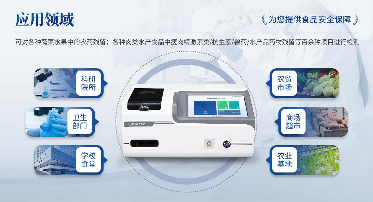 全自動(dòng)農(nóng)獸藥殘留檢測(cè)儀可對(duì)各種蔬菜水果中有機(jī)磷和氨基甲酸酯類農(nóng)藥殘留;各種肉類水產(chǎn)食品中瘦肉精激素類殘留,抗生素殘留,獸藥殘留,水產(chǎn)品藥物殘留等百余種項(xiàng)目進(jìn)行快速檢測(cè)。該設(shè)備廣泛應(yīng)用于蔬菜批發(fā)市場(chǎng)、超市、商場(chǎng)、食藥監(jiān)等部門的蔬菜和水果中的農(nóng)藥殘留檢測(cè)。