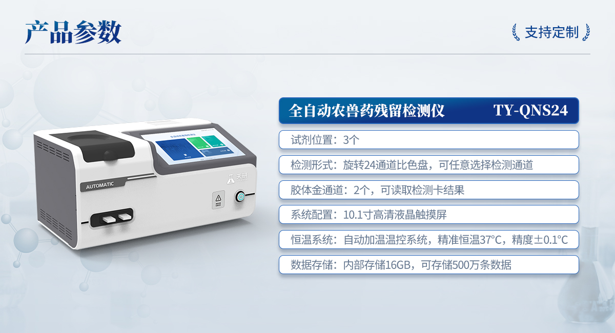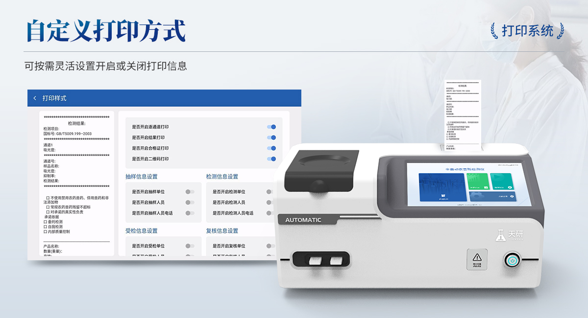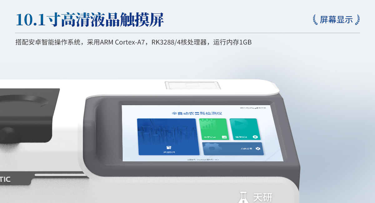 | 1. 試劑位置:3個(gè) | 2. 農(nóng)殘檢測(cè)盤:旋轉(zhuǎn)24通道比色盤,可任意選擇檢測(cè)通道,自動(dòng)對(duì)應(yīng)選擇通道。 | 3. 膠體金通道:2個(gè),可讀取檢測(cè)卡結(jié)果,自動(dòng)采集、處理分析,自動(dòng)判斷檢測(cè)結(jié)果,并具備自動(dòng)判空功能。 | 4.系統(tǒng)配置:10.1寸高清液晶觸摸屏,采用ARM Cortex?-A7,RK3288/4核處理器,運(yùn)行內(nèi)存1GB。Android7.1.1 系統(tǒng)分辨率1280×800。 | 5.恒溫系統(tǒng):具有自動(dòng)加溫溫控系統(tǒng),精準(zhǔn)恒溫37℃,精度±0.1℃。 | 6.添加系統(tǒng):儀器按照試劑要求自動(dòng)、按時(shí)、按量加入試劑,并且自動(dòng)對(duì)未正常放置的樣本或異常的樣本進(jìn)行檢查并提示。 | 7.清洗功能:儀器具備回流及自動(dòng)清洗管路功能,避免試劑污染。 | 8.混勻功能:設(shè)備具備自動(dòng)混勻功能。 | 9.光源校準(zhǔn):設(shè)備可自動(dòng)校準(zhǔn),確保檢測(cè)準(zhǔn)確度。 | 10.實(shí)時(shí)監(jiān)控:儀器測(cè)試過(guò)程中屏幕顯示運(yùn)行狀態(tài),可實(shí)時(shí)查看。 | 11.數(shù)據(jù)存儲(chǔ):內(nèi)部存儲(chǔ)16GB,可存儲(chǔ)500萬(wàn)條數(shù)據(jù)。 | 12.樣品多選功能:設(shè)備具備樣品一鍵多選功能,選擇樣品自動(dòng)匹配檢測(cè)通道。 | 13.項(xiàng)目預(yù)設(shè):可提前設(shè)置單個(gè)及多個(gè)相同或不相同的檢測(cè)任務(wù),可單次或者多次調(diào)取,減少檢測(cè)時(shí)間。 | 14.自定義打印系統(tǒng):內(nèi)置自定義打印系統(tǒng),可按需靈活設(shè)置開(kāi)啟或關(guān)閉:產(chǎn)品合格證(國(guó)家農(nóng)業(yè)部標(biāo)準(zhǔn)),二維碼,抽樣信息、檢測(cè)信息,受檢信息等信息的打印。 | 15.A4版本報(bào)告打印功能:設(shè)備可自動(dòng)生成A4版報(bào)告,A4報(bào)告帶二維碼,可掃描二維碼生成電子版,并可識(shí)別真?zhèn)巍?/td> | 16.傳輸方式:儀器配備無(wú)線通信模塊: 4G(APN)通訊模塊、Wifi模塊,藍(lán)牙傳輸模塊,同時(shí)具有USB接口以及RJ45接口能以多種方式實(shí)現(xiàn)數(shù)據(jù)保存和數(shù)據(jù)傳輸功能,設(shè)備數(shù)據(jù)可以同步上傳至平臺(tái)。 | 17.系統(tǒng)17.數(shù)據(jù)監(jiān)管系統(tǒng):設(shè)備自帶監(jiān)管平臺(tái),并可同步對(duì)接監(jiān)管平臺(tái),數(shù)據(jù)可局域網(wǎng)和互聯(lián)網(wǎng)數(shù)據(jù)上傳,檢測(cè)結(jié)果可直接傳至食品安全監(jiān)管平臺(tái)。達(dá)到食品安全問(wèn)題預(yù)估、預(yù)警。 | 18.系統(tǒng)遠(yuǎn)程更新功能:無(wú)需設(shè)備返廠,即可遠(yuǎn)程實(shí)時(shí)升級(jí)全新系統(tǒng),節(jié)省時(shí)間成本及避免運(yùn)輸造成設(shè)備損。 |